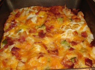 Place 1 cup of frozen hashbrowns on the bottom of a sprayed 8x8 baking pan. Top with 2 slices cubed white or wheat bread. Sprinkle onions, tomato, bell pepper, bacon and cheese on top of hashbrowns and bread.