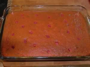 Poke cake with fork all over, while cake is hot pour icing over & spread.
