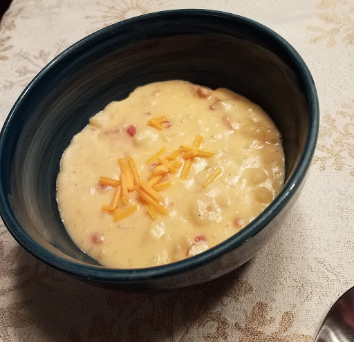 A nice and creamy take on Baked Potato Soup without using Heavy Cream. I topped it with Croutons and it was great.