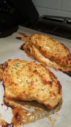 Mix together the remaining ingredients and spread evenly over each piece of chicken. Cover all exposed areas of chicken to prevent drying out. Sprinkle with a little extra parmesan cheese.