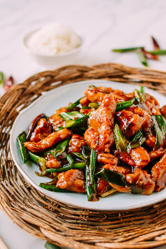 Let the sauce simmer for another 2 minutes, and slowly stir in the cornstarch-water mixture until the sauce coats the back of a spoon. Add the chicken and the green portions of the scallions. Toss everything together for another 10 seconds.