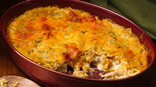 2 Break up taco shells into bite-size pieces. Place half of pieces in casserole. Top with shredded chicken, half of the cooking sauce mixture and half of the cheese. Repeat layers with remaining ingredients.