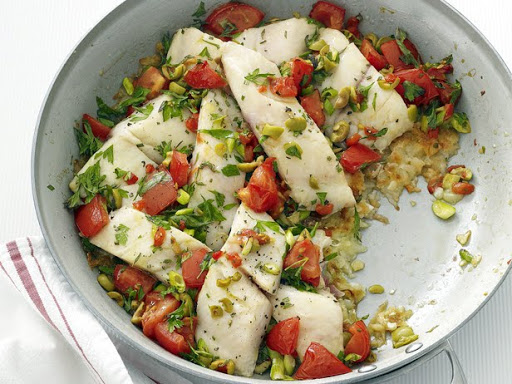 Meanwhile, mix the olives, tomatoes, roasted peppers, scallions and parsley in a bowl. Cut the fish into 12 pieces and season with the dried herbs, salt and pepper.
