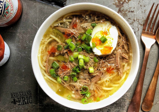 To prepare, place a serving of spaghetti in a bowl, ladle some of the roast with stock over the noodles, top with the halved hard-boiled eggs and green onions. Serve with soy sauce, hot sauce, and ketchup at the table. Enjoy!