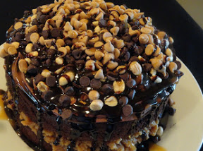 when cakes are completely cooled ice your first layer with peanut butter mixture.with your chocolate icing create a border around the cake. add your peanuts and chocolate chips ,syrup and caramel ..... repeat this step for your top layer.