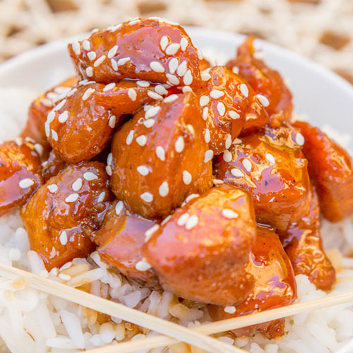 Crank the heat up to high, stirring occasionally. Cook until sauce has reduced. This process can take between 10 and 15 minutes. When the sauce thickens up and starts sticking to the chicken, add sesame seeds. Stir.