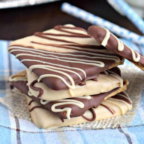 If desired and you want to decorate tops, reheat excess chocolate for 10-15 seconds. Pour white chocolate PB into a small ziploc bag. Snip off the corner and drizzle over milk chocolate side of dipped grahams. Repeat with the milk chocolate onto the white chocolate side of the cracker. Allow to set, about 15-30 minutes. Store in airtight container at room temperature. ENJOY.
