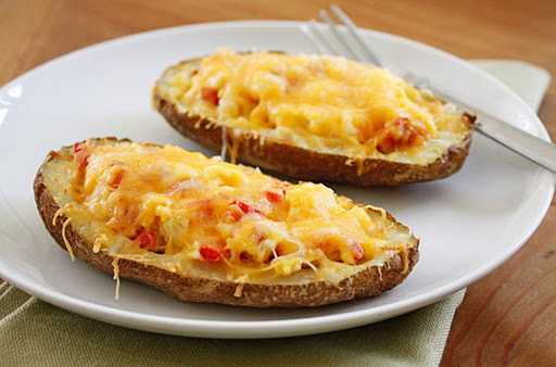 Pierce potatoes and bake in mircowave. Cool when done. Scoop out potato leaving about 1/4 inch.In a large bowl whisk eggs,milk salt and pepper . Add onions pepper and ham and mix well. Spray a non-stick skillet with olive oil spray and cook egg mixture, stirring often. Fill potato skin with eggs and top with 1tbsp cheese. Place Heat oven to 450 degrees. Place filled skins on baking sheet and bake 5-10 minutes until cheese is melted.