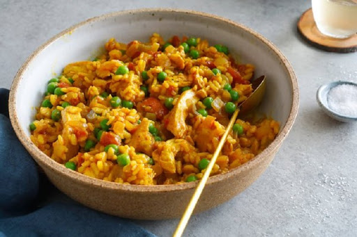 Stir in turmeric, peppers and chicken breasts and continue cooking until chicken begins to turn golden.