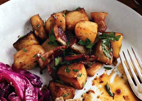 •Mix 1/4 cup water, vinegar, and sugar in small bowl. Combine oil and bacon in heavy large skillet; sauté over medium-high heat until fat is rendered, 3 to 4 minutes. Add onion and garlic; sauté until onion is golden, about 5 minutes. Add turnips and potatoes; sprinkle with 1 teaspoon sea salt and toss 5 minutes. Reduce heat to medium-low, cover, and cook until vegetables are almost tender, stirring and turning vegetables occasionally, about 15 minutes.