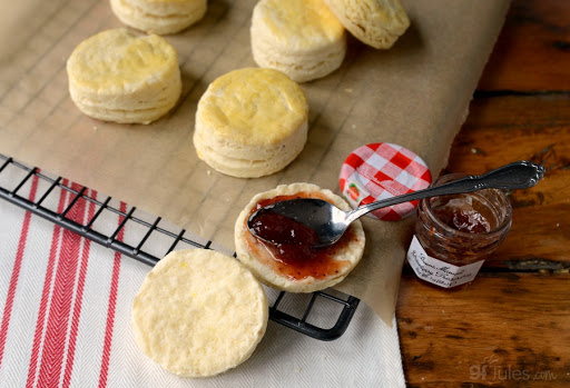 Dip a biscuit cutter into more gfJules Flour and push straight down to cut the biscuits; do not twist with the cutter. Repeat with remaining dough, gathering dough scraps together when necessary, and re-patting flat to cut more biscuits.