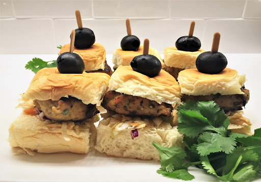 Cut the slider rolls in half, spread mayo on each bun, top with chicken burger and cole slaw, secure with a pickle or an olive on a pick and enjoy.