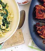 Drain the egg noodles and add to the spinach along with the herbs, if using. Divide among 4 plates and serve with 2 chicken thighs each.