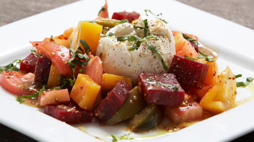 4.Cut the beets into ¼” medallions and set in the fridge to cool. Meanwhile, cut the heirloom tomato into ½” pieces, taking care not to lose too much of the seeds.