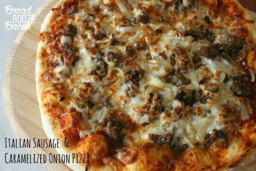 Saute onions in 3 T. olive oil, add salt and pepper. Cook stirring occasionally until golden and caramelized about 20 minutes. Increase the heat to medium high and add the sausage. Break up sausage and continue to cook, until cooked through. Set aside to cool slightly.