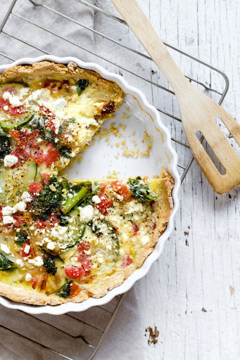 Cut veggies to even sizes and toss with olive oil, salt and pepper and roast at 400 until slightly tender. In bowl whisk eggs, spices and cream. Arrange veggies in pie crust and pour egg mixture over until 3/4 full. Dot with goat cheese and push down a little. Bake for 45+? minutes until egg mixture is set. Let rest 5 minutes before serving.