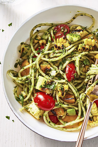 Chop squash, zucchini, pepper and onions; add to bowl with pesto. Cut kernels from cobs; add to bowl along with tomatoes, parsley and cooked pasta. Toss to combine. Serve at room temperature.