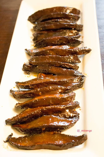 Slice the mushrooms mix all ingredients except for the extra BBQ sauce and marinate the mushrooms for about 30 minutes. Then bake in the oven @ 400 F and once they are tender baste with more bbq sauce bake and then repeat for the other side.
