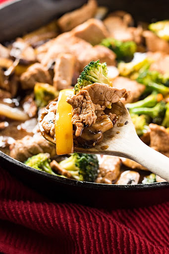 Easy Garlic Pork Stir Fry - A quick and easy pork stir fry recipe that is packed full of delicious, tender, meat and vegetables! Broccoli, mushrooms, bell peppers, and onions come together with a super flavorful stir fry sauce to make this a healthier dinner the whole family will love!