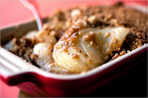 3. About 30 minutes before serving, spread the crumble topping over the pear mixture in an even layer. Bake 20 minutes, or until the fruit is bubbling and the topping is nicely browned. Remove from the heat, and allow to cool for at least 10 minutes before serving.