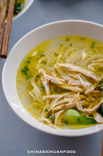 Transfer the noodles to serving bowls, top with shredded chicken and pour the extra stock to cover the noodles.