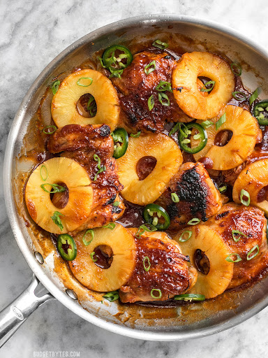 Adjust your oven's rack so that the skillet will be about 6 inches from the broiler unit and turn the broiler on to high. Transfer the skillet to the oven and broil for about 5 minutes, or just until the BBQ sauce caramelizes on the edges of the chicken and pineapple. If you don't have an oven safe skillet** you can transfer the chicken, pineapple, and ALL of the sauce to a casserole dish for broiling, or skip the broiling step and enjoy as is.