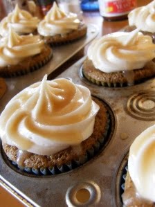 Once the syrup has cooled to just above room temperature, drizzle it on top of the frosted cupcakes, and serve relatively soon (the syrup might start crystallizing and stop tasting so deliciously of rum).