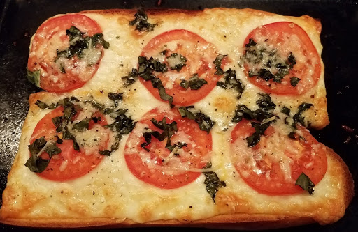 My margarita style take on cheese garlic bread. This could be used as a flatbread pizza type of appetizer as well.