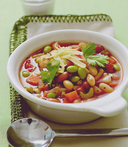 Stir in chili powder, cumin, cinnamon, ground red pepper, and salt; cook 30 seconds, stirring. Add tomatoes, broth, and water; heat to boiling. Reduce heat to low; cover and simmer 15 minutes. Stir white kidney beans and pink beans into Dutch oven; cover and cook 10 minutes longer. Stir in frozen edamame and cook, uncovered, 5 to 7 minutes or until edamame are just tender, stirring occasionally.