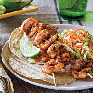 4. Combine cabbage and carrots. Remove shrimp from skewers just before serving. Serve shrimp in warm tortillas with cabbage mixture and lime wedges.