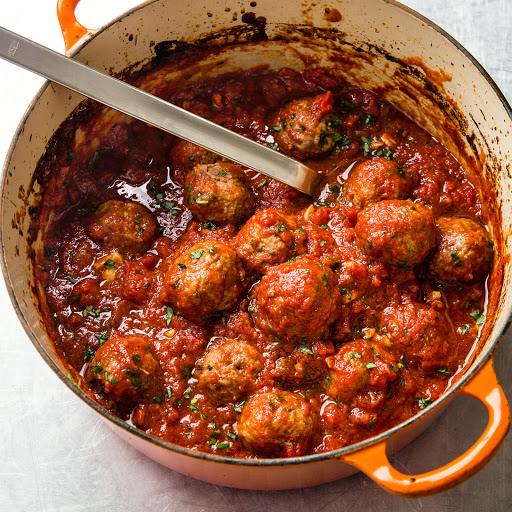 1. FOR THE MEATBALLS: Adjust oven rack to lower-middle position and heat oven to 400 degrees. Place saltines in large zipper-lock bag, seal bag, and crush saltines fine with rolling pin (you should have 1 cup). Combine saltines and milk in large bowl and let sit for 5 minutes for saltines to soften. Mash with fork until smooth paste forms.