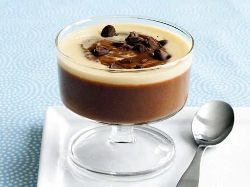 Divide the chocolate pudding among dishes and top with the vanilla pudding. Cover with plastic wrap and refrigerate until set, at least 2 hours. Chop some chocolate chips to sprinkle on top.
