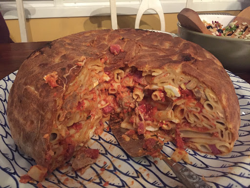 To remove Timpano from pan, invert onto serving dish or cutting board and then allow to cool another 30 minutes. THIS IS A VERY IMPORTANT STEP or it will fall apart when cutting. To serve, slice Timpano as you would a pie and serve with extra sauce and romano/parmesan.