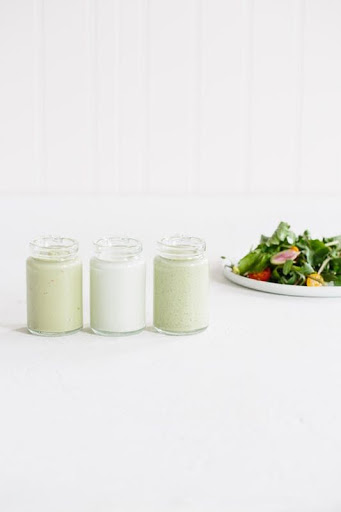 Avocado lends a pretty pale green hue and makes this just-spicy-enough dressing even creamier. Blend together 2 ounces of goat cheese, half an avocado, a pinch of red pepper flakes, and a big splash of water. Season to taste with kosher salad and thin with more water if needed.