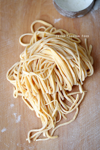 The ratio between egg and water is adjustable. More egg liquid creates chewier taste. More water creates softer texture. So for lo mein noodles and chow mein noodles, I recommend using two middle size eggs. I tried three eggs previously but figure that that the egg taste is overwhelmingly strong for me. So my best ratio is 2 larger size eggs+20ml water. If you plan to make noodle soup, you can use one egg+100ml water for 2 cups of flour.