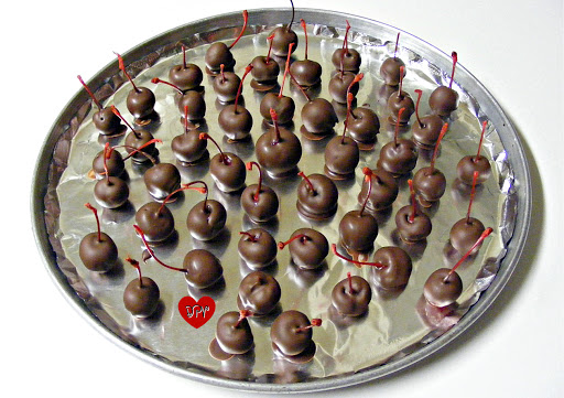 None of that sickening sweet goo in the center of these! Just stemmed maraschino cherries dipped in dark chocolate. Perfect for Valentine's Day or your Christmas candy tray.