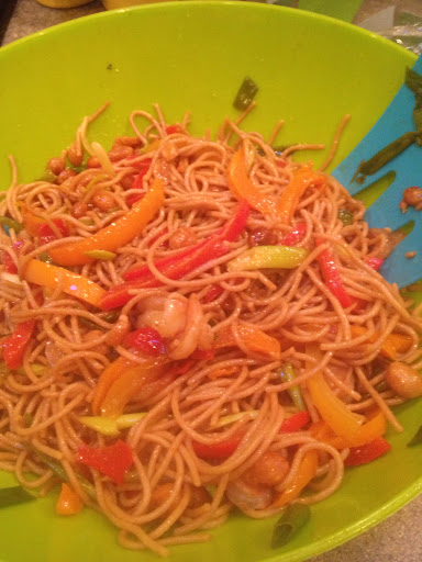 Can add chicken or shrimp, cooked in same dressing before or along with peppers.