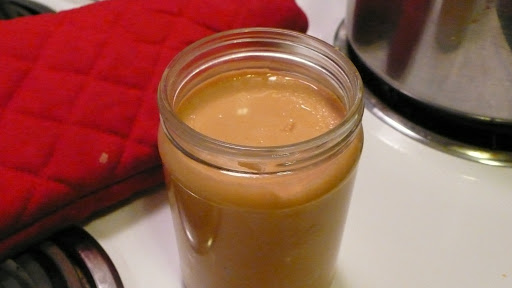 5. Spoon the peanut butter into a recycled glass jar. This recipe will just about fill a 16oz glass jar. I reused a jar from previously store-bought organic peanut butter.