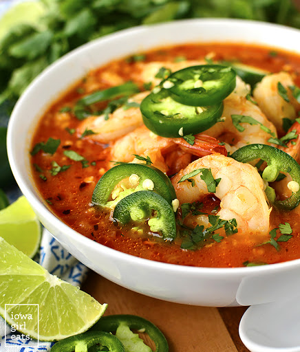 Turn heat back up to high to bring the soup to a boil then add shrimp and boil until cooked through - 1-2 minutes. Scoop soup into bowls then top with cooked rice. Add sliced raw jalapeños (these add a ton of flavor and heat vs just being a garnish so don’t skip!) and chopped cilantro then serve with lime wedges.