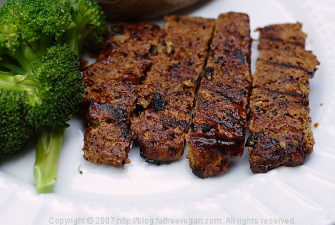 Remove it from the oven and carefully re-cut each strip, going over each cut to make sure that the ribz will pull apart easily later. Generously brush the top with barbecue sauce. Take it to the grill and invert the whole baking dish onto the grill (or use a large spatula to lift the seitan out, placing it sauce-side down on the grill). Brush the top of the seitan with more sauce:
