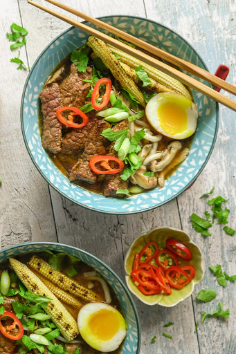 Add the beef to each bowl, along with half a soy marinated egg. Top with coriander, spring onions and red chilli. Serve and enjoy!