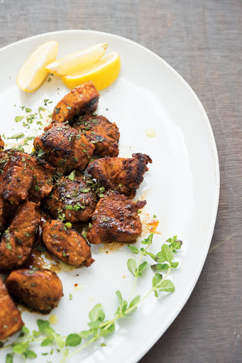 Tip: Don’t cut the pork tenderloin too small. Cutting it into 1- to 1½-inch cubes produced more surface area, allowing the spice rub to quickly penetrate and season the meat. Any smaller and the meat cooked too quickly.