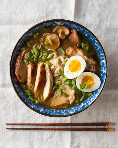 Ask your butcher to remove the rib bone from the chicken breasts (leaving the skin on), or use bone-in, skin-on chicken breasts and increase the oven roasting time 5-10 minutes, as needed. You can also cut your ramen prep time in half by using a store-bought whole rotisserie chicken, simply slice off as much as you wish, and add to the ramen.