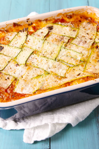 For the final layer, make a zucchini lattice. Layer zucchini noodles side by side at a diagonal in the baking dish. Lift the bottom half of every other noodle and lay another zucchini noodle across diagonally. Repeat until top layer is full.