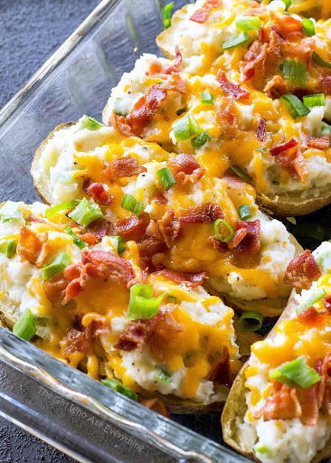 Preheat oven to 400. Place potatoes on baking sheet and rub them with oil and bake for 1 hour. Slice the butter into pats. Place in a large mixing bowl and add the bacon and sour cream. Remove the potatoes from oven and lower heat to 350. Cut each potato in half lengthwise, scrape out inside into bowl being careful not to tear the shell. Leave a small rim of potatoes intact for support. Smash the potatoes into the butter, bacon and sour cream mixture. Add the cheese, milk, seasoned salt, green onions and pepper to taste. Mix together well. (IMPORTANT: IF YOU PLAN TO FREEZE, DO NOT ADD THE GREEN ONIONS). Fill the potato shells to heaping, top with a little more grated cheese and bake for 15-20 minutes.