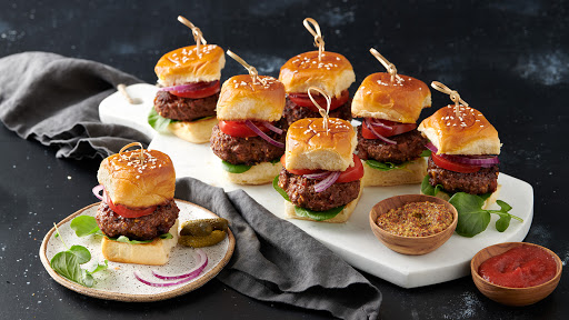 Serve mini burgers on toasted buns and top with your favorite burger fixings.