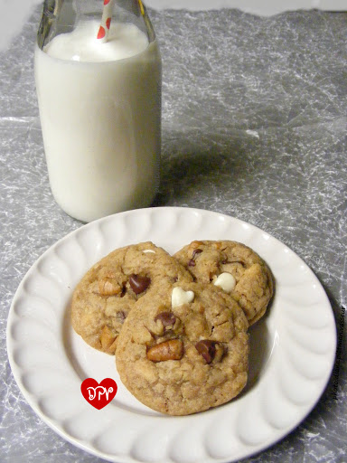 Stir the sugar mixture into the flour mixture, just until combined. Stir in the white chips, semi-sweet chips, and pecans.
