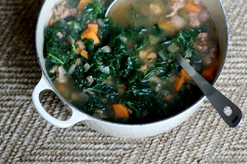 5. At the end, bring soup to a brief boil and add one large bunch of kale leaves to the soup. Lower to a simmer for a few more minutes. Cook time is up to how soft you want your potatoes.
