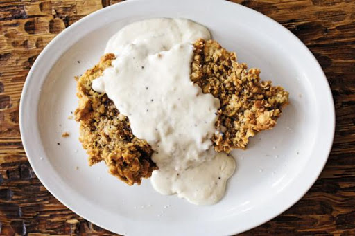 Mix first 4 ingredients and set aside on a plate or wax paper. Whisk eggs in a large bowl, then add buttermilk and beer and whisk to blend. Set aside. In a deep, heavy skillet, heat oil to 350 degrees. While oil is heating, prepare the steaks by dredging them in flour mixture, coating evenly. Shake off any excess. Dip in egg batter, and then again in flour, evenly coating the batter so it is dry on the outside. When oil temperature reaches 350 (a drop of batter will sizzle when dropped into it), gently slide one steak into the oil. Cook about 3 minutes, then turn it, taking care not to break the crust, and cook 3 more minutes, or until nicely browned. Drain on paper towels. Repeat with the other steaks. Hold cooked steaks in a 225-degree oven until all are done. Serve with Cracked-Pepper Gravy. Serves 4.