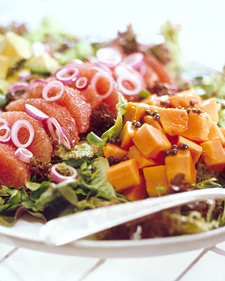 Remove the seeds from the papaya, and reserve for vinaigrette. Cut papaya into 1/2-inch-thick slices, and arrange slices on other side of the grapefruit sections. Top with onion rounds. Drizzle the vinaigrette over the entire salad, and serve immediately.